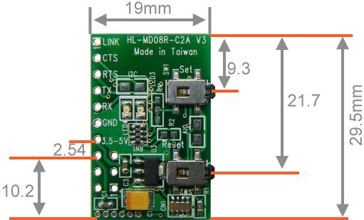 HL-MD08R-C2A內建天線設計, 解決DIY天線的困惱, 避免造成天線不匹配、訊號強度損耗、訊號反饋等情況. 本款解決這個惱人的RF問題,將2.4GHz天線內建置模組內,讓您輕鬆徜徉體驗藍海。